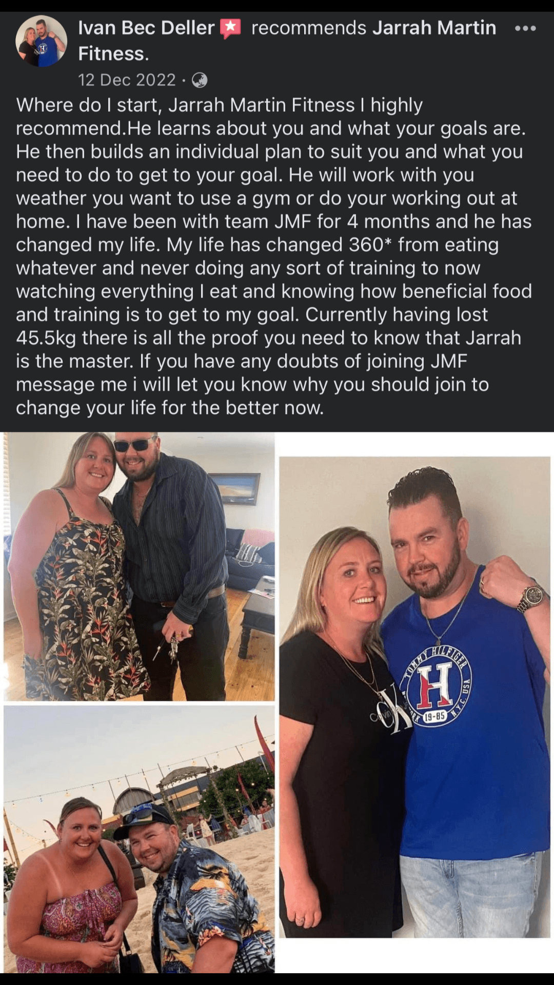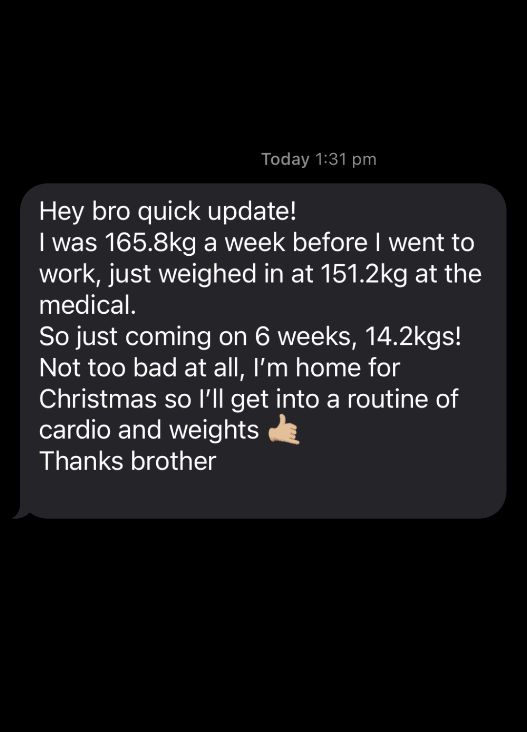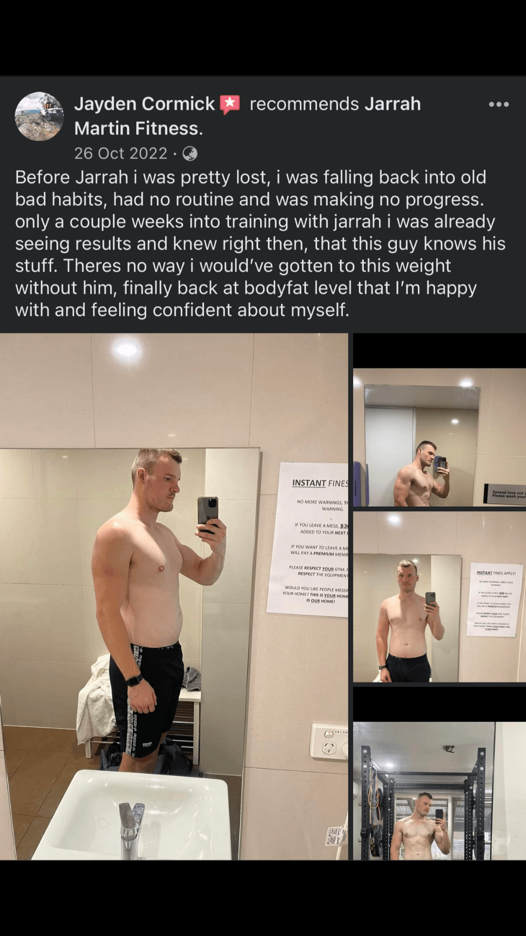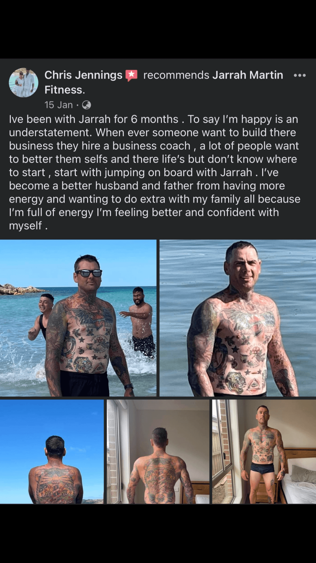 You'll get access to Jarrah and our team of world class coaches who have helped 1000's of men lose weight and transform their bodies. Any questions or queries, we'll be there to answer those in our private group. The level of accountability and support we provide is unmatched, we're here to help you along your weight loss journey and beat this for good.
