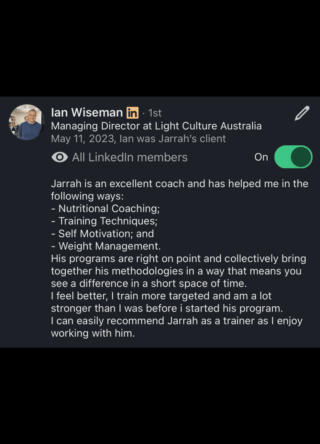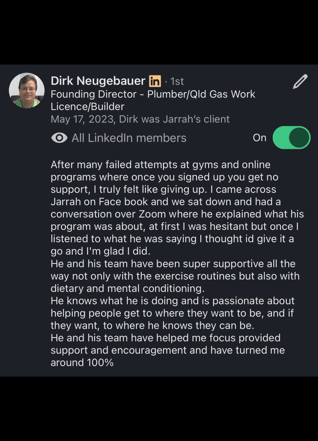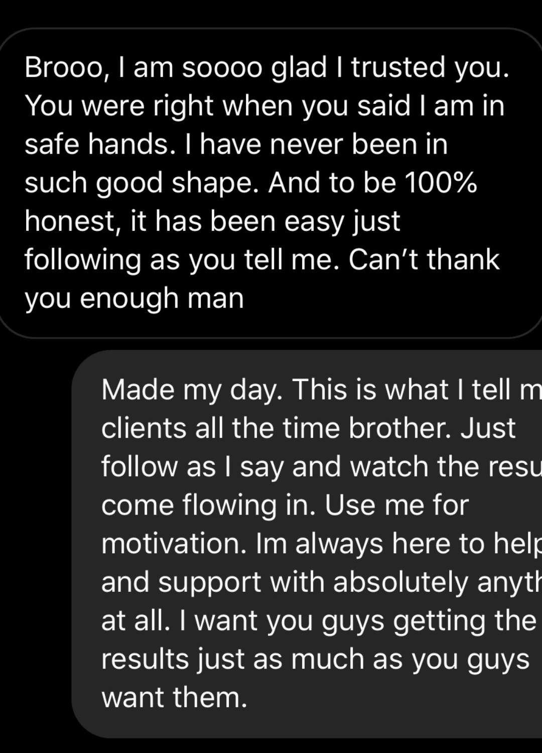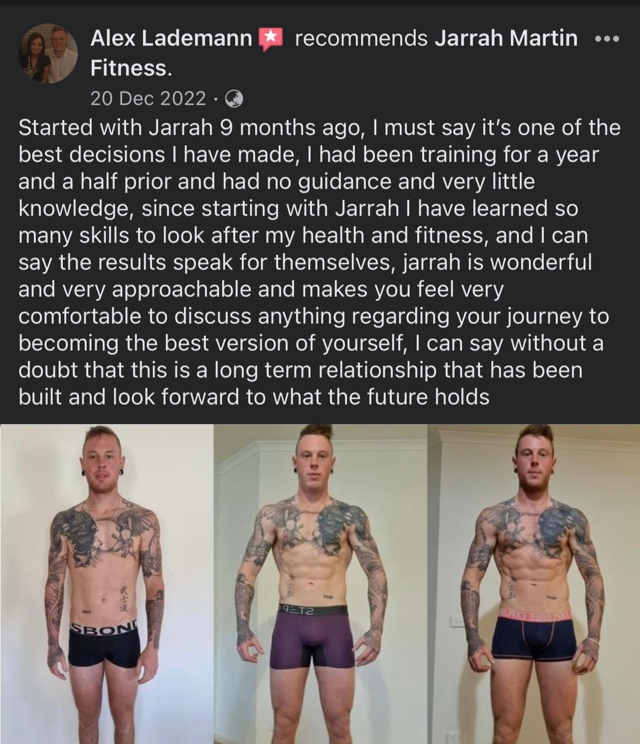 You'll get access to Jarrah and our team of world class coaches who have helped 1000's of men lose weight and transform their bodies. Any questions or queries, we'll be there to answer those in our private group. The level of accountability and support we provide is unmatched, we're here to help you along your weight loss journey and beat this for good.