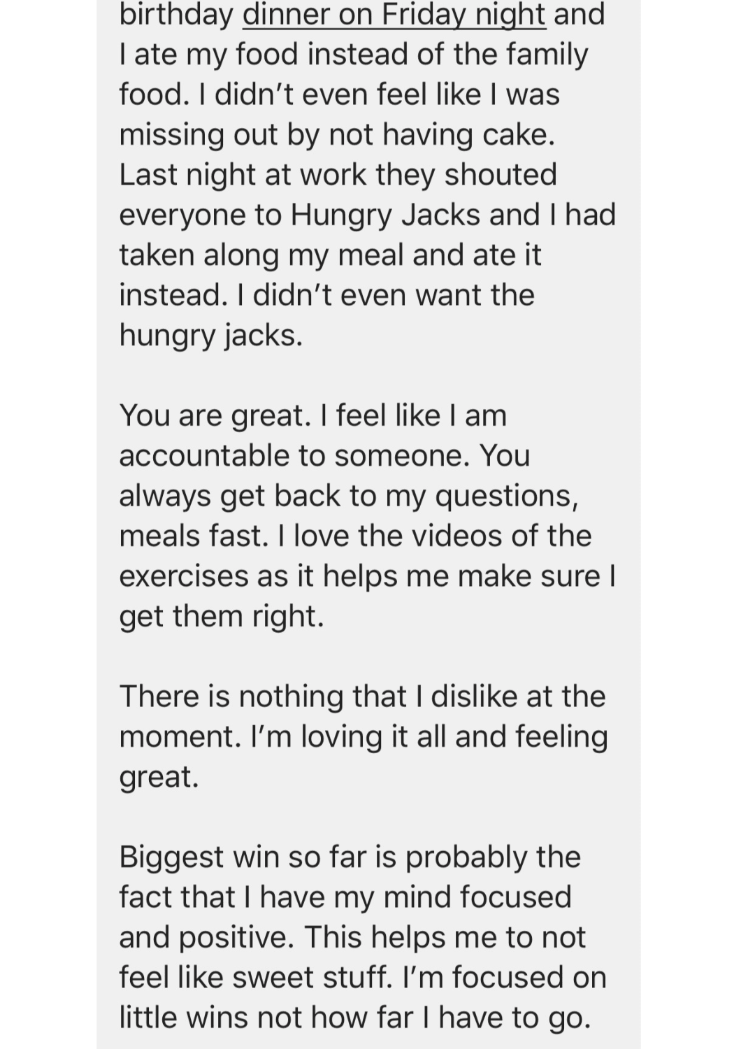 Picture yourself being less stressed, having more energy for the kids and your partner, beating the yo-yo dieting, being free of food restrictions, being able to eat the foods that you love and still lose the kgs, no more losing weight and then regaining it, finally putting an end to weight loss and having a future where you’re happy and confident with your body.